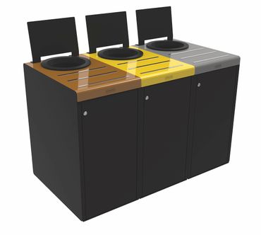 Für eine zusammenhängende Abfalltrennstation für mehrere Abfallarten benötigen Sie die Behälter in Ausführungen Ihrer Wahl plus ein Set mit Seitenwänden als Abschluss an beiden Seiten für jede zusammenhängende Station. Eine Station erhält keine Zwischenwände zwischen den einzelnen Behältern.