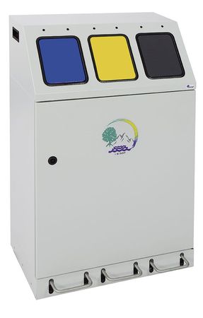 Der Kompaktsammler ist aus vollständig verzinktem Qualitätsstahlblech gefertigt und hochwertig strukturiert pulverbeschichtet. Standardmäßig verfügt dieser 3-fache Kompaktsammler über drei selbstschließende Einwurfklappen in anthrazit, gelb und blau. Feuer- und geruchshemmend. Im Behälterinneren sorgen drei Einsätze aus ebenfalls verzinktem Stahlblech mit einem Fassungsvermögen von 3 x 30L für optimale Abfallaufnahme. Die Inneneinsätze werden durch eine frontseitig eingelassene und per Vierkantverschloss verschließbare Flügeltür entnommen. Frontseitig sorgen zwei Stellfüße für den Ausgleich bei Bodenunebenheiten.