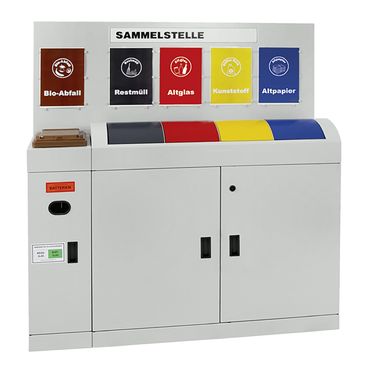 Das Abfalltrennsystem überzeugt durch robustes Design und höchste Funktionalität. Gefertigt aus verzinktem Qualitätsstahl und mit einer strukturierten Pulverbeschichtung versehen, ist es besonders schlag- und kratzfest. Die langlebige Oberfläche sorgt für eine widerstandsfähige Nutzung auch bei hohen Anforderungen. Die Sammelstation ermöglicht die Trennung von bis zu sieben Abfallfraktionen: vier verzinkte 45-Liter-Behälter mit farbigen Pendeldeckeln für Papier, Kunststoff, Metall und Restmüll, ein 10-Liter-Kunststoffbehälter für Bioabfall sowie ein 3-Liter-Behälter für Altbatterien. Die frontseitigen Flügeltüren ermöglichen eine einfache und ergonomische Entleerung aller Innenbehälter, während der Behälter für Bio-Abfälle komfortabel nach oben entnommen wird. Eine rückseitig angebrachte Kennzeichnungstafel unterstützt durch individuell bestückbare Piktogramme die intuitive Nutzung und erleichtert die Zuordnung der Abfallfraktionen. Außerdem ist der Behälter als nicht brennbar eingestuft (DIN 4102, Brandschutzklasse A1).