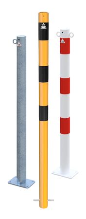 Dieser ortsfeste Absperrpfosten Ø 60 mm ist in mehreren Ausführungen für unterschiedliche Zwecke und Voraussetzungen am Standort erhältlich. Er ist wahlweise zum Einbetonieren oder zum Aufdübeln verfügbar sowie in mehreren Farbausführungen: feuerverzinkt und unbeschichtet, zusätzlich beschichtet in Weiß mit roten reflektierenden Streifen für die Verkehrssicherung oder zusätzlich beschichtet in Gelb mit schwarzen Warnstreifen für den Einsatz im Werkschutz, in Lager- oder Produktionsbereichen und Logistik. Ausführungen mit Ösen ermöglichen es, mehrere Pfosten mit einer Kette oder einer Schnur miteinander zu verbinden.