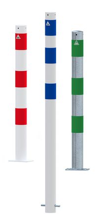 Dieser Absperrpfosten Ø 76 mm ist konzipiert als Rammschutz für E-Ladesäulen. Er ist in mehreren Farbausführungen erhältlich, wahlweise zum Einbetonieren oder zum Aufdübeln: feuerverzinkt und unbeschichtet oder zusätzlich pulverbeschichtet in Weiß. Zur besseren Sichtbarkeit verfügen alle Ausführungen über drei reflektierende Streifen aus Folie mit Reflexionsklasse RA1/A, wahlweise in Blau, Rot oder Grün.