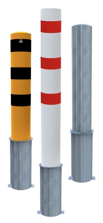 Dieser herausnehmbare Stahlrohrpoller Ø 193 mm wird mit einer feuerverzinkten Bodenhülse ohne Verschluss (ca. 500 mm Unterflur) geliefert. Je nach Einsatzbereich stehen drei Ausführungen zur Auswahl: feuerverzinkt und unbeschichtet sowie zusätzlich in Weiß beschichtet und mit roten reflektierenden Streifen für die Kennzeichnung im Verkehr und in Gelb mit schwarzen Warnstreifen für den Werkschutz, für Produktionsbereiche, Lager und Logistik. Die Gesamthöhe ist wahlweise 1500 mm oder 2000 mm.