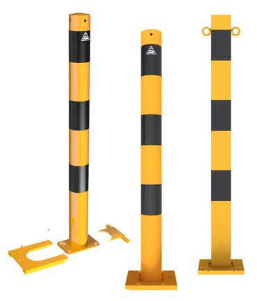 Dieser abnehmbare Absperrpfosten in Gelb mit schwarzen Warnstreifen steht auf einer Bodenplatte, die mit der Einschubplatte zum Aufdübeln auf dem Boden befestigt wird. Die Einschubplatte wird mit einer Innensechskantschraube verriegelt, sodass der Absperrpfosten im Handumdrehen für eine freie Durchfahrt entfernt werden kann. Die Oberfläche ist feuerverzinkt und zusätzlich beschichtet in Gelb mit schwarzen Warnstreifen für den Werkschutz, für Produktionsbereiche, Lager und Logistik. Der Absperrpfosten ist als Rundrohrpfosten mit Ø 76 mm und Ø 89 mm sowie als Vierkantrohrpfosten 70 x 70 mm erhältlich in Ausführungen mit und ohne Ösen zur Befestigung einer zusätzlichen Absperrkette.