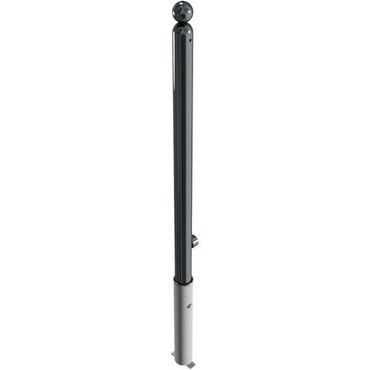 Dieser leichte herausnehmbare Absperrpfosten kann als Begrenzungspfosten von Fußgängerbereichen, Einfahrten, Fahrbahnen, Sicherheitszonen usw. eingesetzt werden. Er besteht aus einem feuerverzinkten Stahlrohr mit einem Durchmesser vom 60 mm und einem Kugelkopf. Der stabile Verschluss und die leichte Handhabung gewähren eine schnell zu öffnende Absperrung. Die Gesamthöhe über Flur liegt bei ca. 950 mm. Der Absperrpfosten ist feuerverzinkt und anthrazitgrau (RAL 7016) beschichtet.