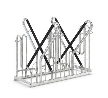 Dieser Anlehnparker zeichnet sich durch eine Vielzahl von Sicherheits- und Komfortmerkmalen aus, die selbst hochwertigste Fahrräder vor Beschädigungen und Diebstahl schützen. Er bietet eine sichere Abstellmöglichkeit für Fahrzeuge wie Pedelecs und E-Bikes mit Reifenbreiten von bis zu 64 mm und erleichtert das Einparken durch seine extrabreiten Radabstände. Die in die Anlehnbügel integrierten Stahl-Rundösen ermöglichen ein einfaches und sicheres An- und Abschließen der Fahrräder. Insgesamt bietet dieser Anlehnparker höchsten Abstellkomfort für Kunden, Mitarbeiter und Gäste und spart gleichzeitig Platz durch seine abwechselnde Tiefen- und Höheneinstellung. Das System ist für die Bodenbefestigung und die Verbindung mehrerer Anlehnparker in Reihen vorbereitet. Darüber hinaus sind die Bodenmontagewinkel bereits im Lieferumfang enthalten, was die Installation erleichtert.