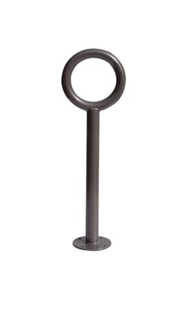 Dieser besonderer Fahrrad-Anlehnpfosten kann in Parkanlagen, vor Supermärkten oder Büros, Geschäften, Spielplätzen usw. eingesetzt werden. Er besteht aus einem feuerverzinktem dunkelgrau beschichtetem Stahlrohr mit einem Durchmesser von 60 mm. Der Rohrring besteht aus einem Stahlrohr mit einem Durchmesser von 48mm; der Außendurchmesser des Rohrrings beträgt 300 mm. Er wird mittels einer Bodenplatten aufgedübelt. Die Gesamthöhe über Flur liegt bei ca. 900 mm.