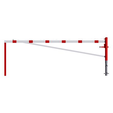 Diese horizontal schwenkbare Schranke mit Verstrebungsrohr und Seilzugverstärkung kann zum Absperren von Zufahrten, Fußwegen, Plätzen und etc. eingesetzt werden. Der Drehpfosten ist aus einem Stahlrohr mit einem Durchmesser von Ø 102 mm gefertigt und ist feuerverzinkt und rot beschichtet. Der Schrankenarm besteht aus einem Aluminiumrohr 100 x 50 mm und ist weiß beschichtet mit rot reflektierenden Streifen. Der Auflagepfosten ( 2 Stück ) besteht aus einem feuerverzinktem und rot beschichtetem Vierkant-Stahlrohr 70 x 70 mm. Die Verriegelung wird mit einem mit Steckbolzen, der in vier Stellungen verriegelt (alle 90°), geschlossen oder geöffnet. Der stabile Verschluss und die leichte Handhabung gewähren eine schnell zu öffnende Absperrung. Die Höhe Überflur liegt bei 950 mm. Die Schrankenarmlänge beträgt wahlweise 3.000, 3.500, 4.000, 4.500, 5.000, 5.500 oder 6.000 mm. Die Drehschranke ist zum Einbetonieren oder zum Aufdübeln mit Bodenplatte lieferbar.