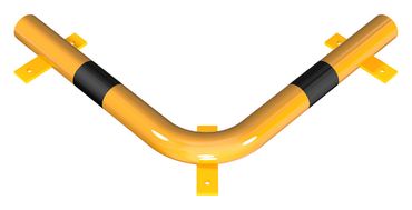 Der Eck-Rammschutz für den Werkschutz besteht aus einem Stahlrohr Ø 76 mm und hat zwei gleich lange Schenkel, die im 90°-Winkel angeordnet sind. Er ist als Anfahrschutz auf betrieblichen Verkehrswegen beispielsweise in Produkion und Logistik konzipiert. Die Befestigung erfolgt über Bodenplatten, die auf dem Untergrund aufgedübelt werden. Die Schenkellänge beträgt jeweils 700 mm, die Höhe 86 mm. Die Oberfläche ist pulverbeschichtet in Gelb mit schwarzen Warnstreifen.