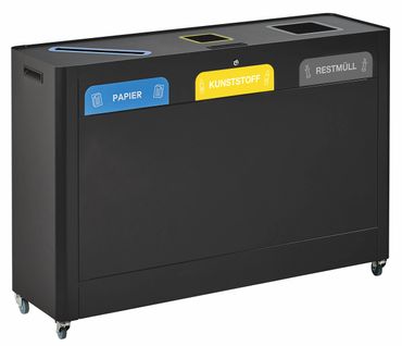 Diese fahrbare Wertstoffsammelstation für zwei oder drei Abfallarten ist äußerst vielseitig einsetzbar. Mit den passenden Aufklebern, die als Zubehör erhältlich sind, kann sie optimal für die Trennung von Restmüll, Verpackungen oder Papier gekennzeichnet werden. Der Korpus besteht aus pulverbeschichtetem Stahl in Mangangrau, robust und langlebig für den täglichen Einsatz.