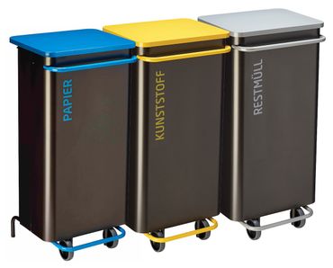 Dieser fahrbare Wertstoffsammler aus pulverbeschichtetem Stahl mit einem Fassungsvermögen von 110 Litern ist vielseitig einsetzbar. Er kann sowohl einzeln genutzt sowie zu einer Wertstoffsammelstation für Restmüll, Verpackungen und Papier kombiniert werden. Der Korpus der Behälter ist Mangangrau. Die farbige Beschriftung sowie die farblich abgestimmten Deckel und Pedale erleichtern die Orientierung bei der Abfalltrennung. Dank glatter Oberflächen und einfacher Reinigung eignet er sich für hygienisch sensible Bereiche wie in der Gastronomie und in Großküchen. Der Deckel lässt sich über ein breites Pedal öffnen, sodass der Behälter nicht mit den Händen berührt werden muss. Ein integrierter Dämpfer schließt den Deckel leise und sicher.