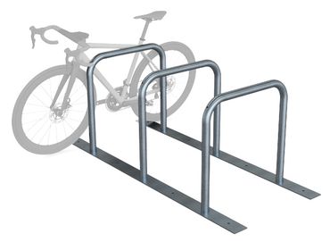 Bei diesen Fahrradbügeln als Anlehnsystem sind drei Fahrradbügel aus Rundrohr Ø 48 mm fest verschweißt auf den beiden Flacheisen, auf dem das System steht. Sowohl einzeln als auch aneinandergereiht zu einem größeren Fahrradabstellplatz macht dieses Fahrrad-Anlehnsystem eine gute Figur. Entdecken Sie auch unsere Anlehnbügel-Reihensysteme in Ausführungen von 2 bis 4 Anlehnbügeln mit Bodenplatten – gleich hier bei uns im Shop!