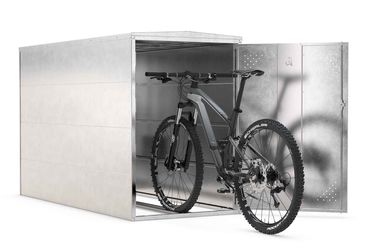 Diese feuerverzinkte und unbeschichtete Ausführung der Fahrradgarage VILM mit Spitzdach verfügt über eine Einstellschiene, die ein Fahrrad mit einer Reifenbreite bis 70 mm aufnehmen kann. Damit ist diese Fahrradgarage für einen großen Teil der Fahrräder und auch für viele Mountainbikes oder Pedelecs und E-Bikes geeignet. Ein Druckzylinderschloss schützt das Fahrrad vor unbefugtem Zugriff, Vandalismus und Diebstahl. Auf Anfrage und gegen Mehrpreis ist die Ausstattung mit einem Münzpfandschloss möglich. Die Fahrradgarage ist ein modulares System mit drei Ausführungen und kann dadurch sowohl als einzelne Fahrradgarage an Wohneinheiten, als Reihenanlage an Mehrfamilienhäusern oder als große Reihenanlage auf dem Firmengelände, als Bike & Ride-Stationen an Bahnhöfen uvm. genutzt werden. Auch hochwertige Fahrräder sowie E-Bikes und Pedelecs schützt VILM zuverlässig vor Witterungseinflüssen sowie Vandalismus und Diebstahl.