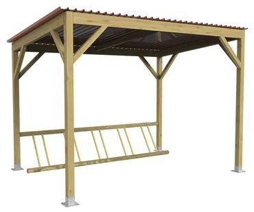 - Fahrradüberdachung aus Holz mit Pultdach aus Stahlblech und integriertem Fahrradständer