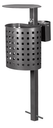 Das Produkt besteht aus einem halbrunden Abfall- sowie Ascherbehälter. Das auf der Oberseite des quadratischen Pfostens montierte Dach schützt die Behälter vor Witterungseinflüssen. Unkomplizierte Entleerung dank schwenk-und abnehmbare Behälter. Automatischer Wasserablauf durch gelochten Boden. Die Befestigung des Pfostens erfolgt durch Einbetonierung.