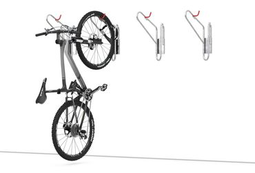 Wand-Hängesystem für die raumoptimierte Unterbringung von Fahrrädern aller Art. Felgenschonende Ummantelung. Der Hängeparker besteht aus einer sehr stabilen Stahlkonstruktion aus Rundrohr mit einer massiven großflächigen Befestigungsplatte. Zwei unterschiedlich geformte Anlehnbügel fixieren das Vorderrad, das in einen kunststoffummantelten Haken eingehängt wird, wobei die empfindlichen Felgen vor Beschädigungen geschützt werden. Um vorhandenen Raum noch besser ausnutzen zu können, stehen drei Versionen mit unterschiedlichen Einstellwinkeln zur Verfügung. Der empfohlene Montageabstand bei Verwendung mehrerer Parker in Reihe beträgt 650 mm. Der Hängeparker ist auf Anfrage auch verzinkt und farbbeschichtet RAL nach Wahl lieferbar.