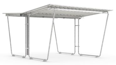 - Zubehör (optional zusätzlich bestellbar): Seitenwand aus Trapezblech oder Polyester; Regenrinne mit Fallrohr