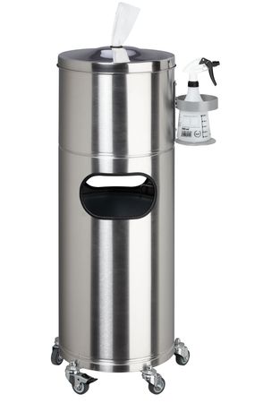Diese mobile Desinfektionsstation aus Edelstahl vereint einen praktischen Papiertücherspender, eine Halterung für Flaschen mit Desinfektionsmittel und einen Abfallbehälter in einem. Der mattierte Edelstahl-Deckel des Papiertücherspenders verfügt über eine Entnahmeöffnung mit schützender Gummitülle. Der Flaschenhalter aus verzinktem Stahlblech ist silber pulverbeschichtet und wird am Kopfteil verschraubt. Der Abfallbehälter verfügt über zwei praktische Einwurföffnungen und verfügt über einen herausnehmbaren Inneneinsatz mit Bügelgriffen (Fassungsvermögen ca. 32 Liter). Zum unkomplizierten Entleeren kann das Kopfteil mit Papiertücherspender abgenommen werden. Der Edelstahl-Fahruntersatz mit fünf Rollen (drei Lenkrollen und zwei Lenkbremsrollen) sorgt für flexible Platzierung und sicheren Stand. Entdecken Sie auch weitere Ausführung dieser Desinfektionsstation – gleich hier bei uns im KELPIO-Shop!
