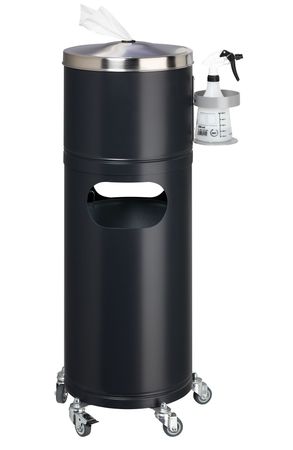 Diese mobile Desinfektionsstation vereint einen praktischen Papiertücherspender, eine Halterung für Flaschen mit Desinfektionsmittel und einen Abfallbehälter in einem. Das Kopfteil für Papiertücher und der Korpus sind gefertigt aus verzinktem Stahlblech mit hochwertiger Pulverbeschichtung in Schwarzgrau. Der mattierte Edelstahl-Deckel des Papiertücherspenders verfügt über eine Entnahmeöffnung mit schützender Gummitülle. Der Flaschenhalter aus verzinktem Stahlblech ist beschichtet in Silber und wird am Kopfteil verschraubt. Der Abfallbehälter mit zwei praktischen Einwurföffnungen verfügt über einen herausnehmbaren Inneneinsatz mit Bügelgriffen (Fassungsvermögen ca. 32 Liter). Zum unkomplizierten Entleeren kann das Kopfteil mit Papiertücherspender abgenommen werden. Der Edelstahl-Fahruntersatz mit fünf Rollen (drei Lenkrollen und zwei Lenkbremsrollen) sorgt für flexible Platzierung und sicheren Stand. Entdecken Sie auch weitere Ausführung dieser Desinfektionsstation – gleich hier bei uns im KELPIO-Shop!