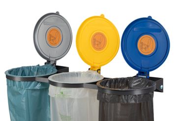 - 3 farbige Kunststoffdeckel für eine gezielte Trennung der Wertstoffe, z.B. Silber für Restmüll, Gelb für Kunststoffe und Metall, Blau für Papier