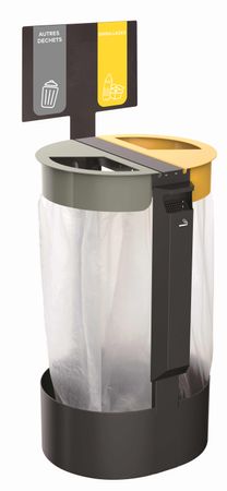 Das im Lieferumfang enthaltene Schild wird an der Müllsackhalterung befestigt und bietet Platz für zwei Piktogramm-Aufkleber. Die Aufkleber werden mit französischen Texten geliefert. Der französische Text lässt sich mit einer Schere entfernen, sodass das Piktogramm dennoch zur Kennzeichnung verwendet werden kann.