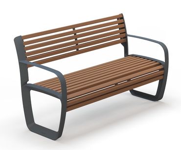Eine Bank, vielseitige Gestaltungsmöglichkeiten: Für die Sitzfläche und die Rückenlehne stehen die Tropenhölzern Iroko oder Sapelli sowie europäische Esche zur Auswahl. Das Gestell mit Armlehnen kann wahlweise in Anthrazitgrau RAL 7016 oder einer RAL CLASSIC-Farbe nach Wahl beschichtet werden.
