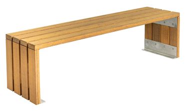 Bei dieser Parkbank ohne Rückenlehne sind die Planken der Sitzfläche und der Seitenelemente längs angeordnet und mit Laserschnitt-Formteilen aus feuerverzinktem Stahl unauffällig miteinander verbunden. Ihr geradliniges Design und ihre komfortable Sitzhöhe machen sie zu einer vielseitig einsetzbaren Sitzgelegenheit für Außenräume. Erhältlich sind vier attraktive Ausführungen mit Belattung aus Iroko- oder Robinienholz, jeweils FSC-zertifiziert bzw. aus schnell nachwachsendem Bambus in heller oder dunklerer Farbgebung. Durch Befestigungsbohrungen in den Laserschnitt-Formteilen kann die Bank sicher auf dem Untergrund aufgedübelt werden.