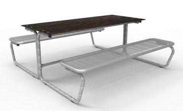 Eine solide und klassische Bank-Tisch-Kombination ist dieser Picknicktisch der Serie RIES mit einer massiven Tischplatte und Sitzflächen aus Drahtgitter. Die hochwertige Spezial-Beschichtung des Drahtgitters sorgt ganzjährig für angenehme Sitztemperaturen sowie schnelles Abtrocknen nach einem Regenguss. Auf der massiven Tischplatte finden Speisen und Getränke oder auch Lernmaterialien und Gesellschaftsspiele ihren Platz. Langlebig, pflegeleicht und wartungsarm – dieser Picknicktisch ist eine ideale Wahl für alle Grünflächen, Außenflächen von Schulen oder öffentlichen Einrichtungen sowie auf dem Firmengelände.
