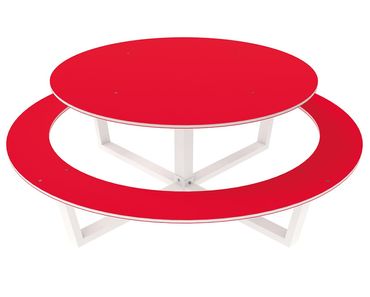 Fröhlich und modern ist dieser Picknicktisch mit runder Tischfläche und runder geschlossener Sitzfläche um den Tisch. Die pflegeleichten und robusten Flächen aus hochdichtem Polythylen (HDPE) liegen auf einer Struktur aus verzinktem Stahl, die neutral in Reinweiß RAL 9010 beschichtet ist. Es sind Ausführungen mit HDPE-Flächen in Rot, Gelb, Grün, Blau und Weiß erhältlich.