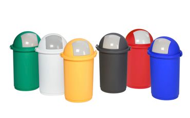 Dieser praktische und farbenfrohe Push-Mülleimer aus Kunststoff fasst ca. 50 Liter und eignet sich ideal für den Einsatz im Innenbereich. Der Behälter ist flüssigkeitsdicht und das abnehmbare Kopfteil mit Einwurfklappe wird mit zwei praktischen Klemmverschlüssen sicher am Behälter fixiert. Als Zubehör ist ein Fahruntersatz mit vier Lenkbremsrollen erhältlich. Sie haben die Wahl zwischen sechs Farben – die Einwurfklappe ist bei allen Varianten in Silber gehalten.