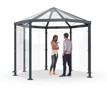 Mit seiner raffinierten Pavillonform und seinem spitzen, lichtdurchfluteten Glasdach in Zeltform ist dieser Pavillon ein schöner und einladende Alternative zu klassischen Raucherunterständen. Der Pavillon aus Stahl und Glas wird als Bausatz zur Selbstmontage geliefert und ist erweiterbar. Die Stahlkonstruktion ist in Anthrazitgrau RAL 7016 sowie in vielen anderen RAL-Farben erhältlich. Auch Ausführungen mit verlängerten Pfosten zum Überpflastern der Fußplatten können bestellt werden.