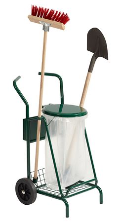 Dieser Reinigungswagen für den Außenbereich verfügt über eine runde Müllsackhalterung mit Deckel. Die Struktur und der Deckel aus pulverbeschichtetem Stahl sind in Moosgrün beschichtet. Mithilfe des Gummibands lässt sich der Müllsack sicher an der Halterung fixieren und schnell austauschen. Seitliche Halterungen am Wagen bieten Platz für Besen, Schaufeln oder ähnliches Arbeitsgerät. Eine zusätzliche Ablagefläche eignet sich für kleines Werkzeug und weiteres Zubehör. Der Wagen ist wahlweise mit Vollgummirädern oder Luftreifen ausgestattet.