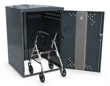 - mit 2 Seitenwänden: als einzelne, eigenständige Rollator-Box nutzbar, sowie als Grundmodul für eine Reihenanlage
