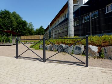 Dieser Standpfosten mit verschweißter Stahlkappe kann als ein Teil von Absperrbarrieren eingesetzt werden. Er besteht aus feuerverzinktem und im Farbton Eisenglimmer (DB 703) beschichteten Stahlrohr mit einer Größe von 70 x 70 mm. Die Gesamthöhe beträgt Überflur ca. 1000 mm. Dieses Stadtzaun ist mit seiner perfekten Linienführung und durch seine Scharnierlaschen auch im Kurvenbereiche ideal. Die Befestigung der separat erhältlichen Zaunfelder an den senkrechten Pfosten (Mittelpfosten mit 4 Verbindungslaschen oder Endpfosten mit 2 Verbindungslaschen) ist so konstruiert, dass die unterschiedlichsten Grad- bzw. Winkelstellungen ausgeführt werden können.