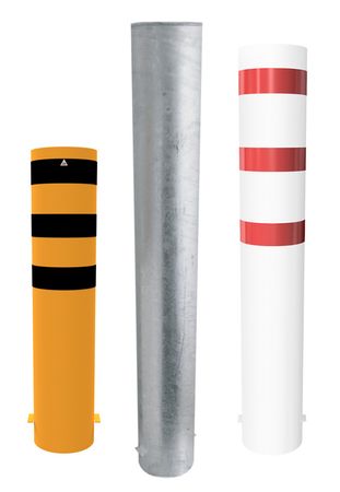 Dieser schweren Stahlrohrpoller Ø 323 mm zum Einbetonieren ist geeignet als Anfahrschutz vor Einfahrten, Hallen, Tankstellen o.ä. und kann eingesetzt werden als Leitpoller vor Rampen und Toren oder, um Dachüberstände zu sichern. Er ist in mehreren Farbausführungen erhältlich – feuerverzinkt und unbeschichtet sowie zusätzlich in Weiß/Rot für die Kennzeichnung im Verkehr und in Gelb/Schwarz für den Werkschutz, für Lager und Produktionsbereiche. Die Gesamthöhe ist wahlweise 1500 mm, 2000 mm oder 2400 mm. Ebenso sind Ausführungen mit unterschiedlichen Stahlkappen erhältlich: aufgeschweißte Stahlkappe oder Stahlkappe mit Betonanker.
