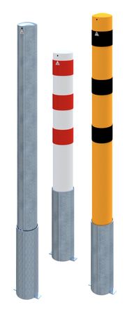 Dieser herausnehmbare Stahlrohrpoller Ø 152 mm wird mit einer feuerverzinkten Bodenhülse ohne Verschluss (ca. 500 mm Unterflur) geliefert. Je nach Einsatzbereich stehen drei Ausführungen zur Auswahl: feuerverzinkt und unbeschichtet sowie zusätzlich in Weiß beschichtet und mit roten reflektierenden Streifen für die Kennzeichnung im Verkehr und in Gelb mit schwarzen Warnstreifen für den Werkschutz, für Produktionsbereiche, Lager und Logistik. Die Gesamthöhe ist wahlweise 1500 mm oder 2000 mm.