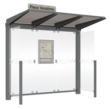 - Alle Ausführungen werden mit Fahrplanschaukasten geliefert, der auf dem dafür vorgesehenen Glaselement der Rückwandverkleidung (Vorbohrungen ab Werk) befestigt wird. Die Wartehalle ist nur in dieser Ausführung mit diesen Vorbohrungen erhältlich.
