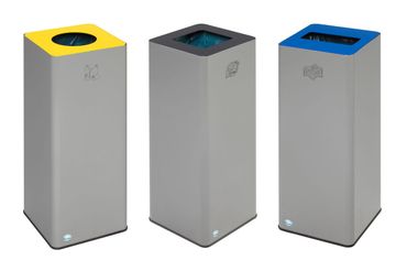 Die praktischen Wertstoffsammler für den Innenbereich, gefertigt aus Stahlblech und ausgestattet mit farbigem Aufsatz mit Einwurföffnung, sind hier in fest konfigurierten Sets zusammengefasst. Im Lieferumfang enthalten ist ein Kantenband zur optionalen Verbindung der Einzelbehälter. Ein Abfallbehälter verfügt über ein Fassungsvermögen von ca. 81 Litern. Die Entleerung des Behälters erfolgt über den abnehmbaren Aufsatz. Ein praktischer Klemmring hält den Müllsack.
