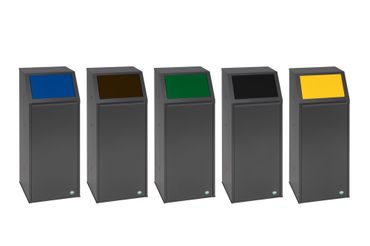 - Die Kennzeichnung für die jeweilige Wertstoffart erfolgt über die farbige Einwurfklappen und die mitgelieferten Piktogramm-Aufkleber.