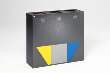 - Drei selbstschließende Einwurfklappen in gelb=Wertstoffe, schwarzgrau=Restmüll und in enzianblau=Papier pulverbeschichtet