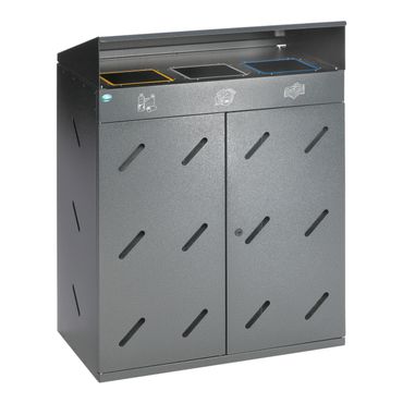- Piktogramm-Aufklebern: silber = Restmüll, blau = Papier, gelb = Wertstoffe