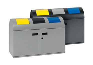 Diese kompakte Wertstoffsammelstation mit einem Fassungsvermögen von je 25 Litern pro Abfallart verfügt über drei farbige Einwurfklappen auf der abgerundeten Oberseite. Diese Einwurfklappen in Grau, Gelb und Blau sind selbstschließend. Die Doppelflügeltür mit integrierten Griffmulden öffnet die Sammelstation mit beiden Flügeln über die gesamte Breite und ermöglicht den komfortablen und schnellen Zugriff auf den Innenraum. Für die sichere Verriegelung der Türen sorgt ein Doppelbartschloss. Im Inneren der Sammelstation befinden sich drei separate Inneneinsätze aus verzinktem Stahlblech mit Bügelgriffen und Kantenschutz im Bodenbereich. Mit den vier höhenverstellbaren Füßen lassen sich kleinere Bodenunebenheiten ausgleichen, sodass die Station sicher steht.