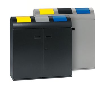 Diese Wertstoffsammelstation für drei Abfallarten verfügt über drei farbige Einwurfklappen auf der abgerundeten Oberseite. Diese Einwurfklappen in Grau, Gelb und Blau sind selbstschließend. Die Doppelflügeltür mit integrierten Griffmulden öffnet die Sammelstation mit beiden Flügeln über die gesamte Breite und ermöglicht den komfortablen und schnellen Zugriff auf den Innenraum. Für die sichere Verriegelung der Türen sorgt ein Doppelbartschloss. Im Inneren der Sammelstation befinden sich drei separate Inneneinsätze aus verzinktem Stahlblech mit Bügelgriffen und Kantenschutz im Bodenbereich. Jeder Einsatz fasst ca. 50 Liter. Mit den vier höhenverstellbaren Füßen lassen sich kleinere Bodenunebenheiten ausgleichen, sodass die Station sicher steht.
