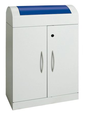 Dieser kompakte Wertstoffsammler eignet sich ideal für alle Räumlichkeiten und ist besonders für die Sammlung von Papier aufgrund seines großen Fassungsvermögens geeignet. Er ist aus verzinktem Qualitätsstahlblech gefertigt und mit einer hochwertigen, strukturierten Pulverbeschichtung versehen, die ihn unempfindlich sowie schlag- und kratzfest macht. Ausgestattet mit einer selbstschließenden Pendelklappe in Enzianblau, ist der Sammler feuer- und geruchshemmend sowie leicht zu reinigen. Im Inneren befindet sich ein verzinkter Stahleinsatz mit einem Fassungsvermögen von 90 Litern. Die Flügeltüren, ausgestattet mit Edelstahltürgriffen, sind mit einem Vierkantschloss sicher verschließbar, und ein Vierkantschlüssel wird mitgeliefert. Frontseitig sorgen zwei Stellfüße für den Ausgleich bei Unebenheiten. Außerdem ist der Behälter als nicht brennbar eingestuft (DIN 4102, Brandschutzklasse A1).