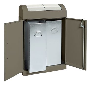 Dieser hochwertige Wertstoffsammler, perfekt für anspruchsvolle Innenräume, vereint Design und praktische Anwendung. Er wird aus verzinktem Qualitätsstahlblech gefertigt und ist mit einer hochwertigen, strukturierten Pulverbeschichtung versehen, die ihn unempfindlich sowie schlag- und kratzfest macht. Die selbstschließenden Pendelklappen aus Edelstahl mit Ledernarbenstruktur sind feuer- und geruchshemmend. Innenbehälter aus verzinktem Stahl erleichtern die Abfallaufnahme. Die Flügeltüren, ausgestattet mit Türgriffen aus Edelstahl, lassen sich mit einem Vierkantschloss sicher verschließen. Frontseitig sorgen zwei Stellfüße für den Ausgleich bei Unebenheiten. Außerdem ist der Behälter als nicht brennbar eingestuft (DIN 4102, Brandschutzklasse A1).