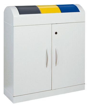 Dieser kompakte Wertstoffsammler überzeugt durch hochwertige Materialien und ein durchdachtes Design – ideal für Büros, öffentliche Einrichtungen oder stilvolle Innenräume. Gefertigt aus verzinktem Qualitätsstahlblech und veredelt mit einer widerstandsfähigen, strukturierten Pulverbeschichtung, ist er besonders robust, schlag- und kratzfest. Farbige, selbstschließende Pendelklappen ermöglichen eine komfortable Handhabung und sind feuer- und geruchshemmend. Im Inneren bieten drei verzinkte Stahleinsätze mit je 45 Litern Volumen ausreichend Platz für eine effiziente Abfalltrennung. Die Flügeltüren mit Edelstahltürgriffen lassen sich über ein Vierkantschloss sicher verschließen. Zwei verstellbare Stellfüße an der Vorderseite gewährleisten stabilen Stand – auch auf unebenem Boden. Außerdem ist der Behälter als nicht brennbar eingestuft (DIN 4102, Brandschutzklasse A1).