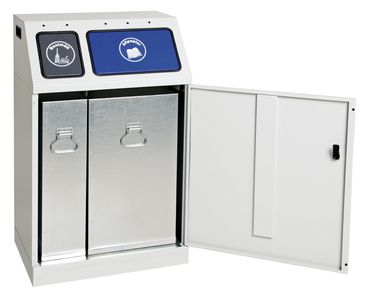 Der Kompaktsammler ist aus vollständig verzinktem Qualitätsstahlblech gefertigt und hochwertig strukturiert pulverbeschichtet. Standardmäßig verfügt dieser 2-fache Kompaktsammler über zwei selbstschließende Einwurfklappen in anthrazit und blau. Feuer- und geruchshemmend. Im Behälterinnern sorgen zwei Einsätze aus ebenfalls verzinktem Stahlblech mit einem Fassungsvermögen von 1 x 30L und 1 x 60L für optimale Abfallaufnahme. Die Inneneinsätze werden durch eine frontseitig eingelassene und per Vierkantverschloss verschließbare Flügeltür entnommen. Frontseitig sorgen zwei Stellfüße für den Ausgleich bei Bodenunebenheiten. Die Behälterfarbe in freundlichem lichtgrau passt sich jeder Einrichtungsumgebung optimal an.