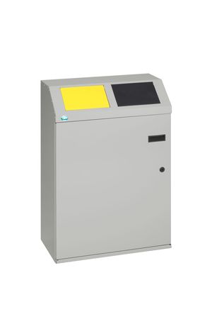- Zwei selbstschließende Einwurfklappen (gelb=Wertstoffe, schwarzgrau=Restmüll)
