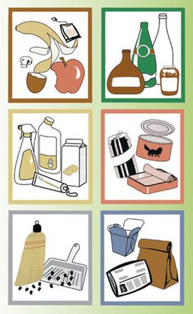 - Mit Symbolen für Papier, "gelber Sack-Abfälle", Restmüll, Glas, Metall und Bio-Abfall